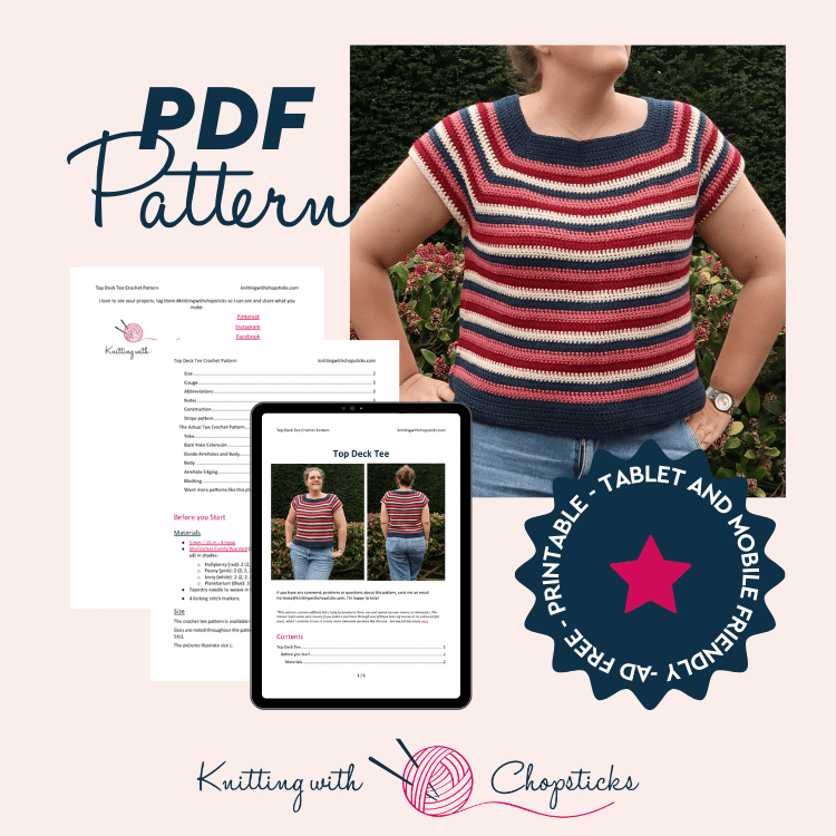 Grab the printable PDF of the Top Deck Tee Crochet Pattern now in my shop, Etsy shop or on Ravelry shop: