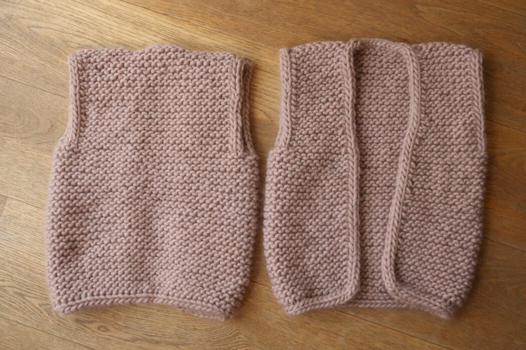 • Knit flat in one piece from the bottom up, then divided to form armholes