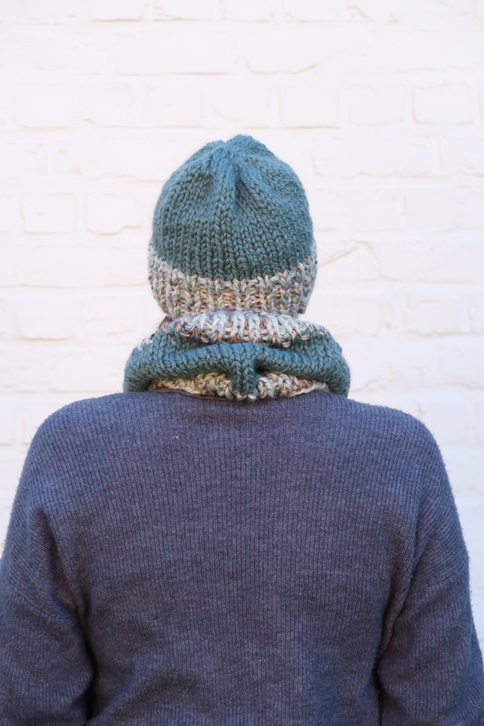 Stay warm and toasty with the Charlie accessories knitting pattern set: a comfy beanie, matching warm cowl, and super cozy chunky mittens.