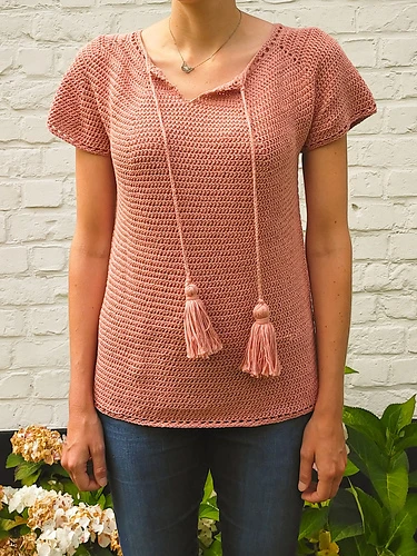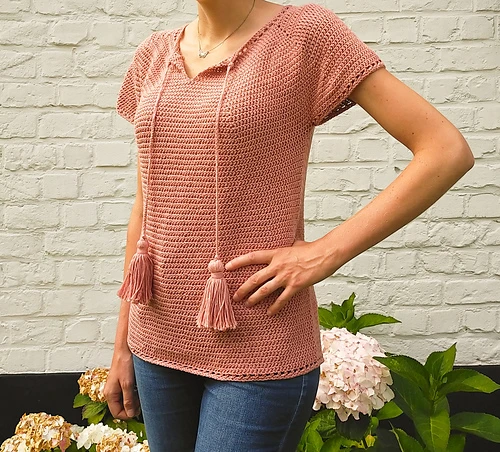 The Julia summer top crochet pattern is a feminine and playful crochet top pattern. Simple eyelets add a lace detail to the sleeves, bottom and neckline.