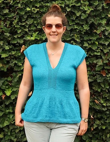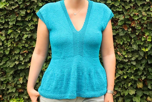 The design features a flatting v-neck (both in the front and back), decorative seed st edging, and a flouncy peplum shape.