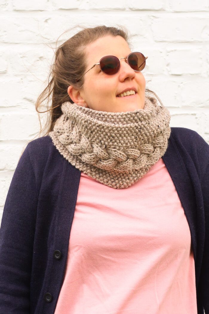 The Tresse infinity scarf is a completely reversible infinity scarf featuring a big braided central cable. Knit flat then seamed into a big twisted loop, it is a great project for knitters looking to move past the basic cable. Looped twice around your neck it fits nice and snug to keep you warm and stylish all winter long.