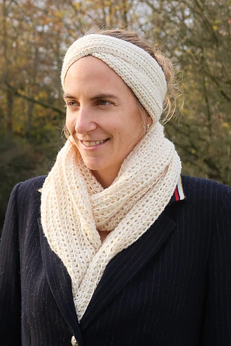 • Simple modern design with a front twist for the headband and fringe for the scarf