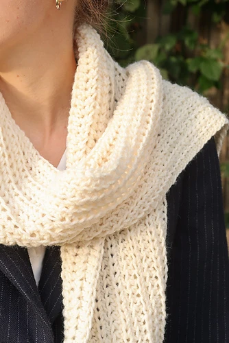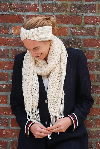 The simple modern crochet design makes these a truly classic set that can be worn day after day. The yarn is lightly textured and naturally stretchy, so the headband won’t slide around, and the front twist adds style while keeping the yarn off your forehead. Your Morning Scarf is a matching classic long scarf. Finished with trendy fringe.